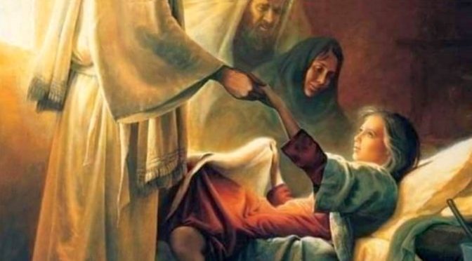 No on ih sve izbaci, uzme sa sobom djetetova oca i majku i svoje pratioce pa uđe onamo gdje bijaše dijete. Primi dijete za ruku govoreći: »Talita, kum!«, što znači: »Djevojko! Zapovijedam ti, ustani!« I djevojka odmah usta i poče hodati. Bijaše joj dvanaest godina. I u tren ostadoše zapanjeni, u čudu veliku. On im dobro poprijeti neka toga nitko ne dozna; i reče da djevojci dadnu jesti.