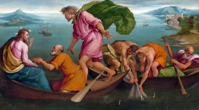 U ono vrijeme: Dok se oko Isusa gurao narod da čuje riječ Božju, stajaše on pokraj Genezaretskog jezera. Spazi dvije lađe gdje stoje uz obalu; ribari bili izišli iz njih i ispirali mreže. Uđe u jednu od tih lađa; bila je Šimunova pa zamoli Šimuna da malo otisne od kraja. Sjedne te iz lađe poučavaše mnoštvo. Kada dovrši pouku, reče Šimunu: “Izvezi na pučinu i bacite mreže za lov.” Odgovori Šimun: “Učitelju, svu smo se noć trudili i ništa ne ulovismo, ali na tvoju riječ bacit ću mreže.” Učiniše tako te uloviše veoma mnogo riba; mreže im se gotovo razdirale. Mahnuše drugovima na drugoj lađi da im dođu pomoći. Oni dođoše i napuniše obje lađe, umalo im ne potonuše. Vidjevši to, Šimun Petar pade do nogu Isusovih govoreći: “Idi od mene! Grešan sam čovjek, Gospodine!” Doista, zbog lovine riba što ih uloviše bijaše se prenerazio on i svi koji bijahu s njime, a tako i Jakov i Ivan, Zebedejevi sinovi, drugovi Šimunovi. Isus reče Šimunu: “Ne boj se! Odsada ćeš loviti ljude!” Oni izvukoše lađe na kopno, ostaviše sve i pođoše za njim.